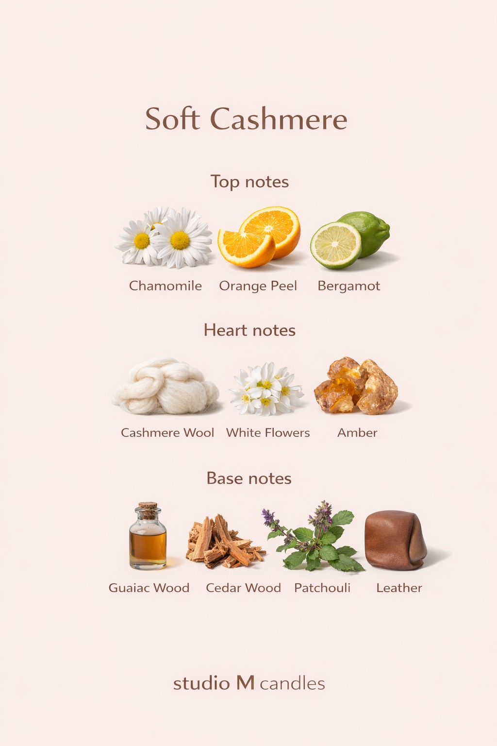 appelsinskal, som skaber en blidt afslappende introduktion. I hjertet mærkes blød, sanselig kashmiruld,
